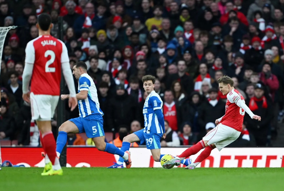 Di Stadion Emirates, Arsenal meraih tiga poin usai mengandaskan Brighton 2-1 lewat Martin Odegaard dan bunuh diri Georgiio Rutter, sedangkan Brighton menipiskan keadaan lewat Diego Gomez.