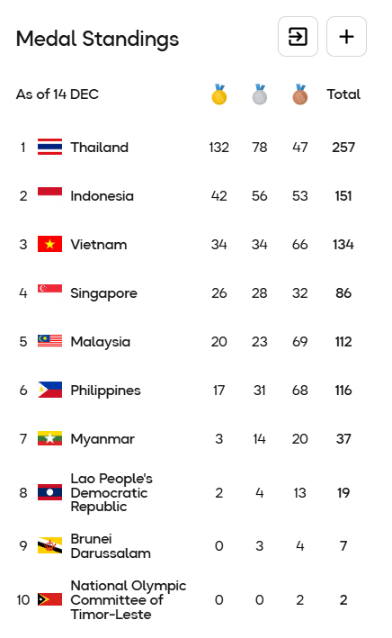 Lantas, bagaimana posisi Indonesia dengan raihan medali yang didapat pada hari ini? Berikut adalah klasemen sementara perolehan medali SEA Games 2025 hingga Minggu (14/12) pukul 23.00 malam menurut situs resmi.