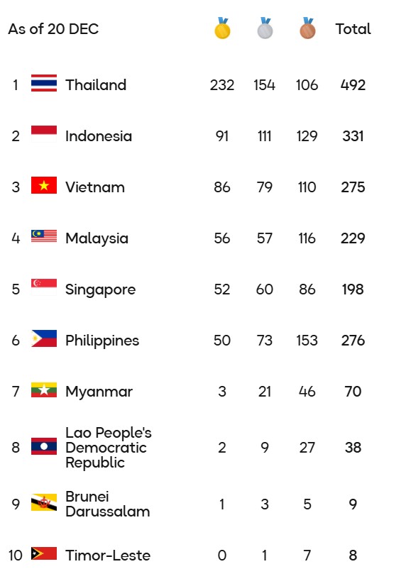 Klasemen Perolehan Medali SEA Games 2025 Jelang Penutupan, Sabtu (20/12): Tim Indonesia Pastikan Peringkat Kedua