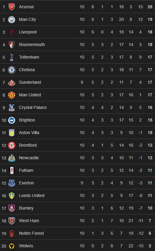 Berikut klasemen terkini Premier League 2025-2026, hingga pekan kesepuluh.