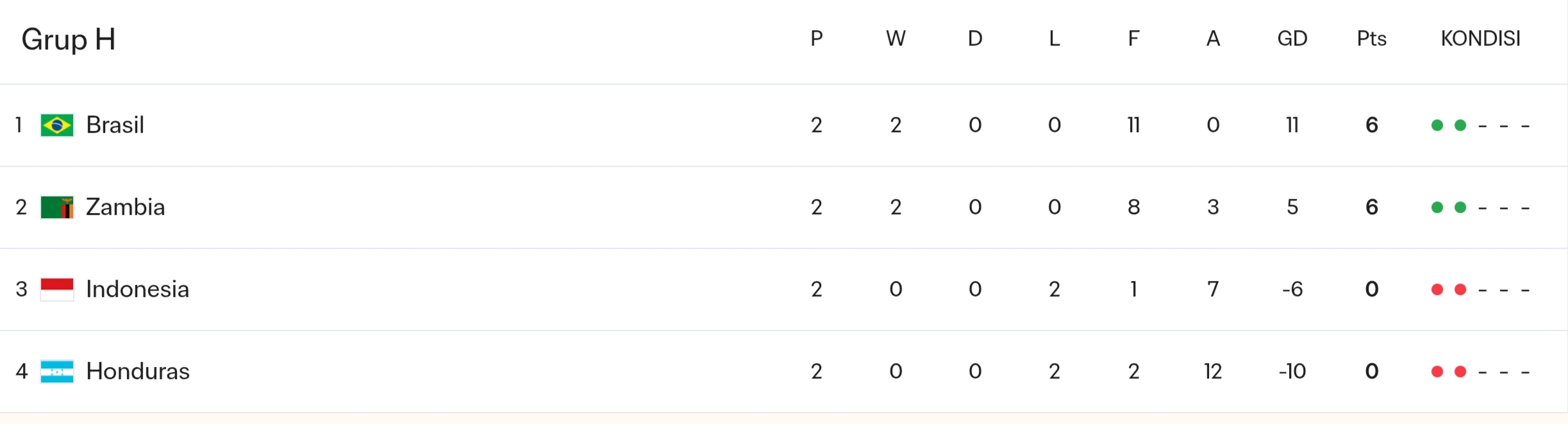 Kekalahan dari Brasil U-17 membuat Timnas Indonesia U-17 tak beranjak dari peringkat 3 Grup H. Sebelumnya, di laga perdananya tim asuhan Nova Arianto itu dikalahkan Zambia 1-3.