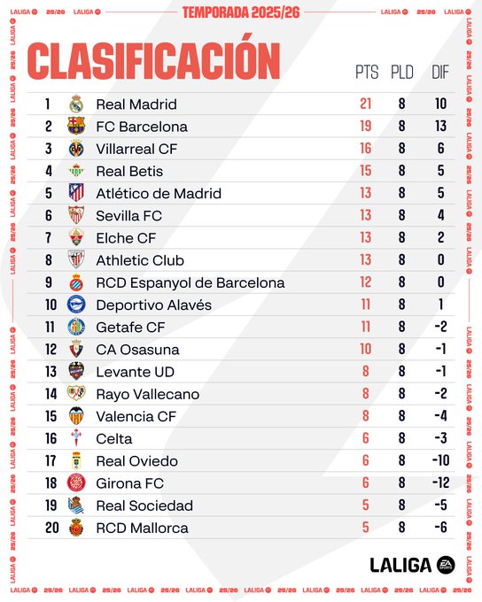 LaLiga 2025/2026 telah menyelesaikan seluruh pertandingan pada pekan kedelapan.