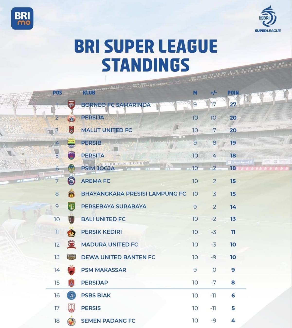 Kemudian, juara bertahan Persib Bandung menguntit di peringkat keempat dengan 19 poin dari 9 pertandingan.
