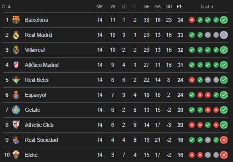 Berikut hasil dan klasemen dari pekan 14 LaLiga: