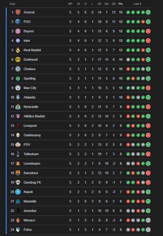 Klasemen Terbaru Liga Champions 2025-2026: Arsenal Berlari Sendirian, Liverpool Hancur Lebur