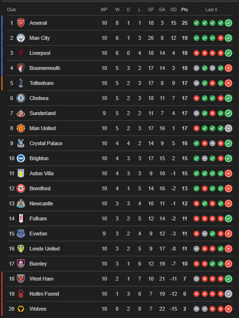 Premier League 2025/2026 hampir menggelar seluruh pertandingan pekan ke-10. Hanya ada satu duel yang belum berlangsung, yakni Sunderland versus Everton.