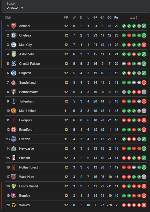 Premier League 2025/2026 hampir menggelar seluruh pertandingan pekan ke-12 pada akhir pekan kemarin.