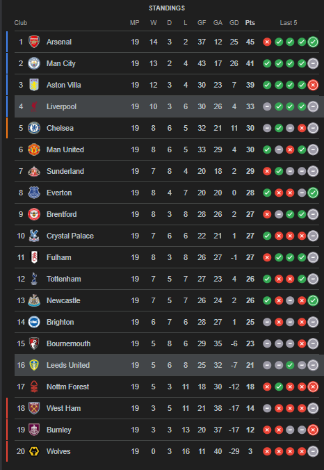 Skuad asuhan Arne Slot itu meraih 33 poin dari 19 laga.