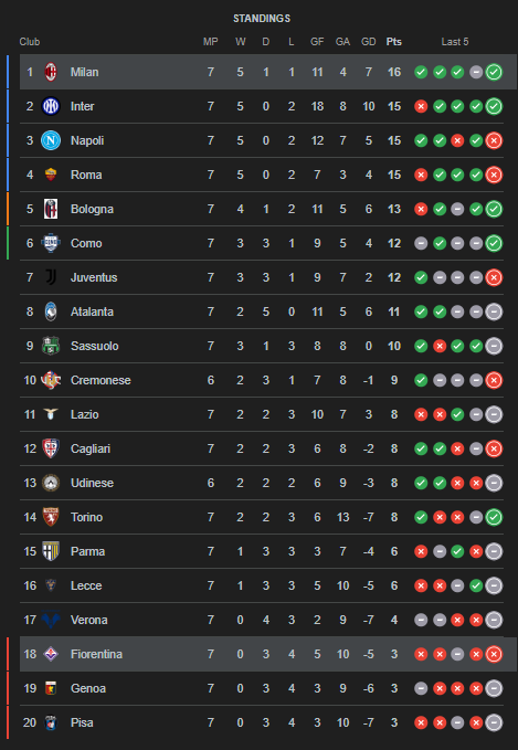 Serie A hampir menuntaskan seluruh pertandingan pada pekan ketujuh. Hanya ada satu laga yang belum digelar, yaitu duel Cremonese versus Udinese.