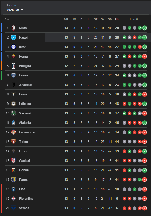 Serie A 2025/2026 telah merampungkan hampir seluruh pertandingan pekan ke-13.