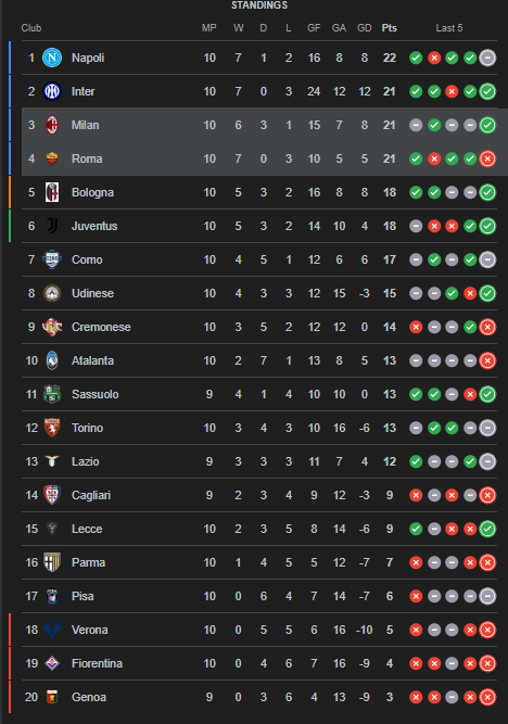 Serie A 2025/2026 telah menyelesaikan hampir seluruh pertandingan pekan ke-10.