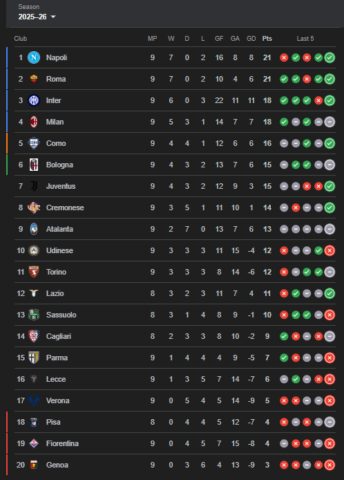 Berikut adalah klasemen terkini Serie A 2025/2026: