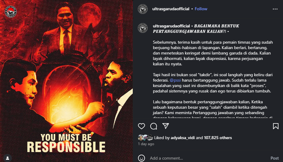 "Bagaimana bentuk pertanggungjawaban kalian? Sebelumnya, terima kasih untuk para pemain Timnas yang sudah berjuang habis-habisan di lapangan. Kalian berlari, bertarung, dan meneteskan keringat demi lambang garuda di dada. Kalian layak dihormati, kalian layak diapresiasi, karena perjuangan kalian itu nyata," kata pernyataan Ultras Garuda.