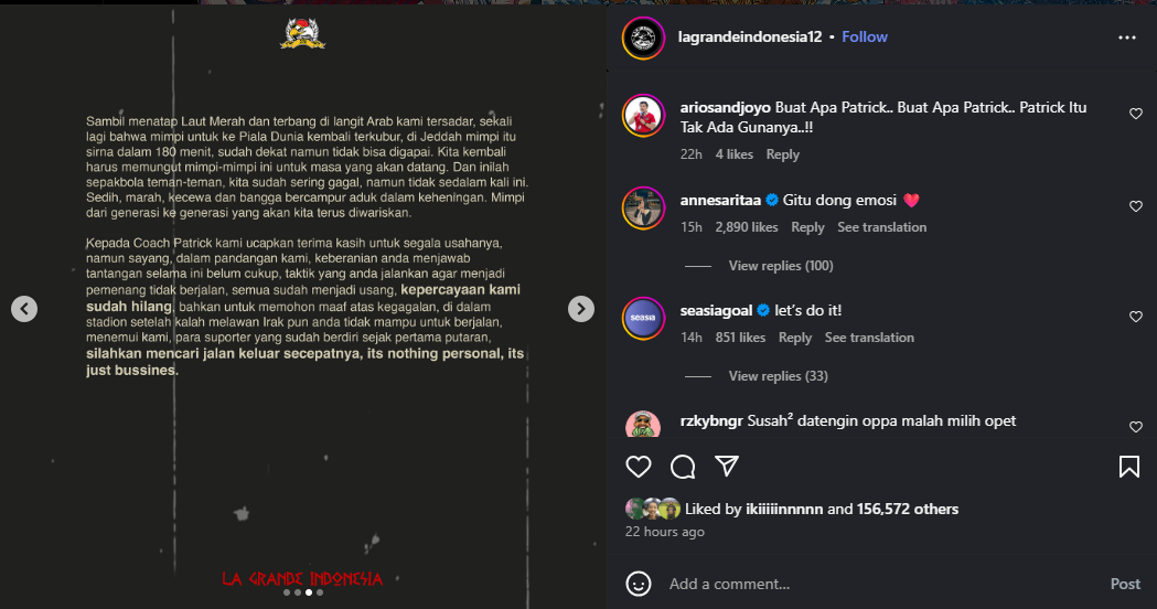 "Sambil menatap Laut Merah dan terbang di langit Arab kami tersadar, sekali lagi bahwa mimpi untuk ke Piala Dunia kembali terkubur, di Jeddah mimpi itu sirna dalam 180 menit, sudah dekat namun tidak bisa digapai. Kita kembali harus memungut mimpi-mimpi ini untuk masa yang akan datang. Dan inilah sepak bola teman-teman, kita sudah sering gagal, namun tidak sedalam kali ini. Sedih, marah, kecewa dan bangga bercampur aduk dalam keheningan. Mimpi dari generasi ke generasi yang akan kita terus diwariskan," kata pernyataan La Grande Indonesia di akun Instagram resminya.