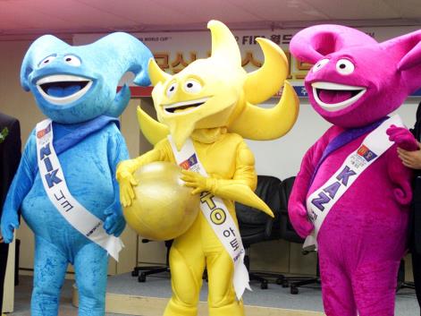 Dan, untuk pertama kali juga maskot yang dipilih merupakan makhluk dunia khayalan. Paling tidak begitulah kisah dari mana asal dari tiga maskot yang diberi nama Ato, Nik, dan Kaz. Ketiga maskot itu disebutkan sebagai makhluk Spheriks yang tinggal di Atmozone. Ato, Nik, dan Kaz merupakan pemain Atmoball.