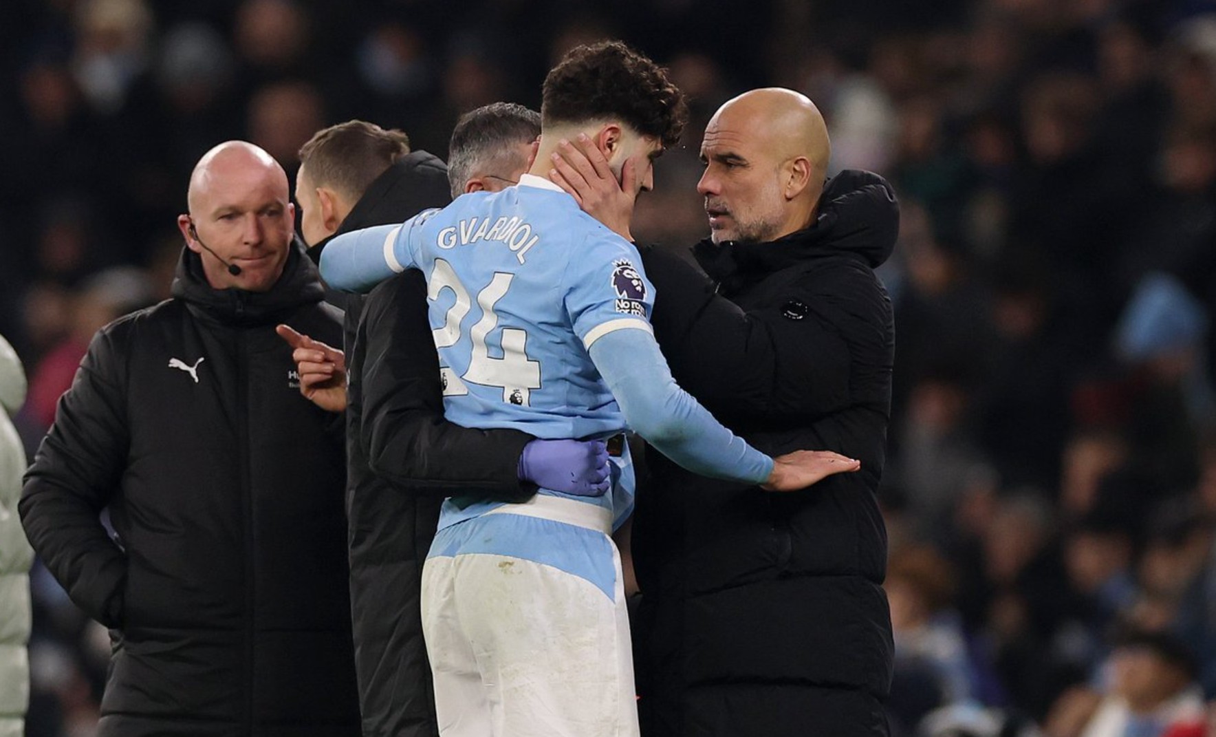 Lini pertahanan City yang sudah kekurangan pemain semakin terpukul ketika Gvardiol harus dibantu keluar lapangan setelah benturan keras pada awal babak kedua.