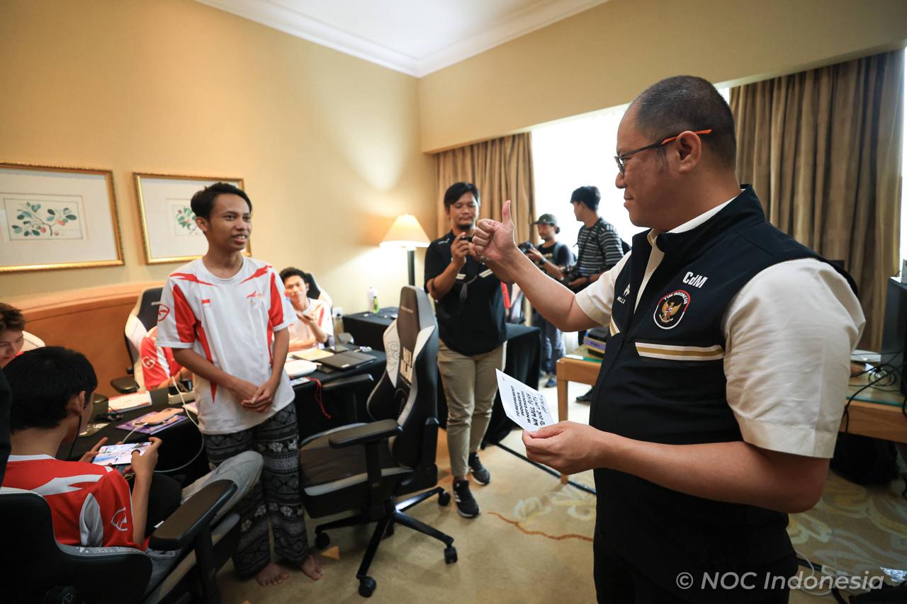 Chef de Mission (CdM) Tim Indonesia, Bayu Priawan Djokosoetono menyempatkan diri untuk meninjau pemusatan latihan cabor e-sport di JW Marriot, Mega Kuningan, Jakarta, Selasa (14/10).