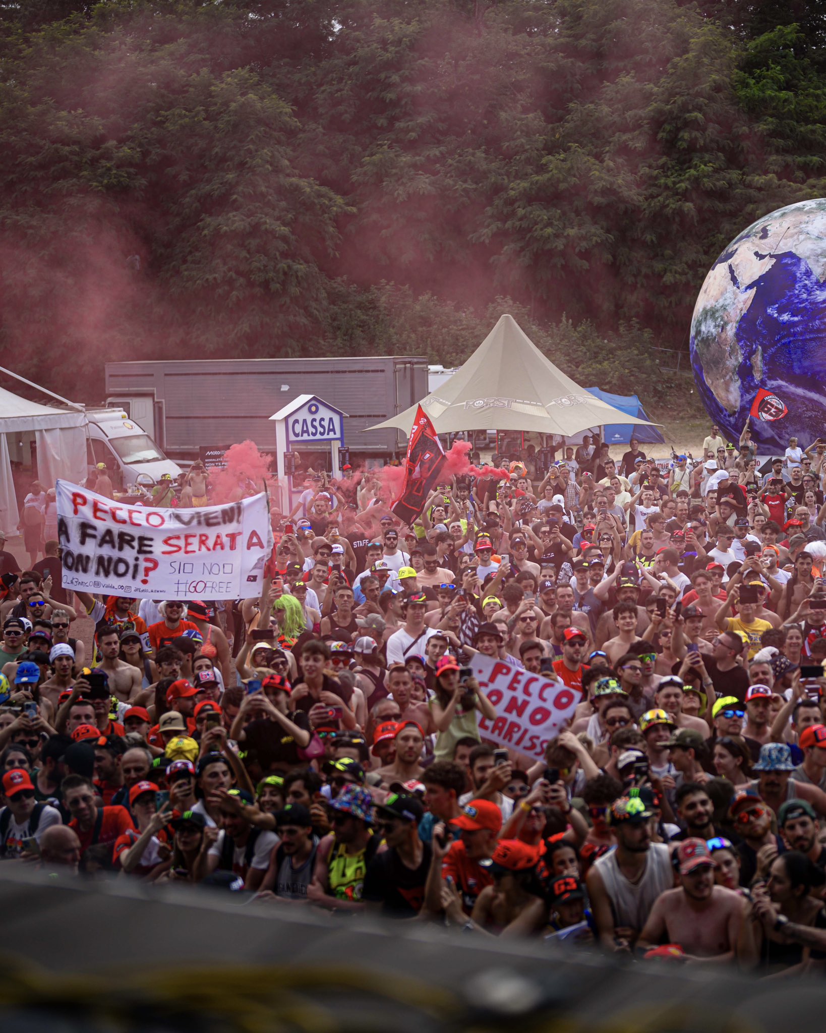 Manager Ducati, Davide Tardozzi yang saat itu berada dekat Marquez langsung melihat ke tribun penonton sembari menunjukkan gestur untuk berhenti mencemooh.