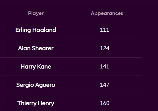 Haaland jauh lebih cepat mencapai angka 100 gol dibandingkan para pencetak gol lain seperti Harry Kane (147), Sergio Agüero (147), dan Thierry Henry (160).