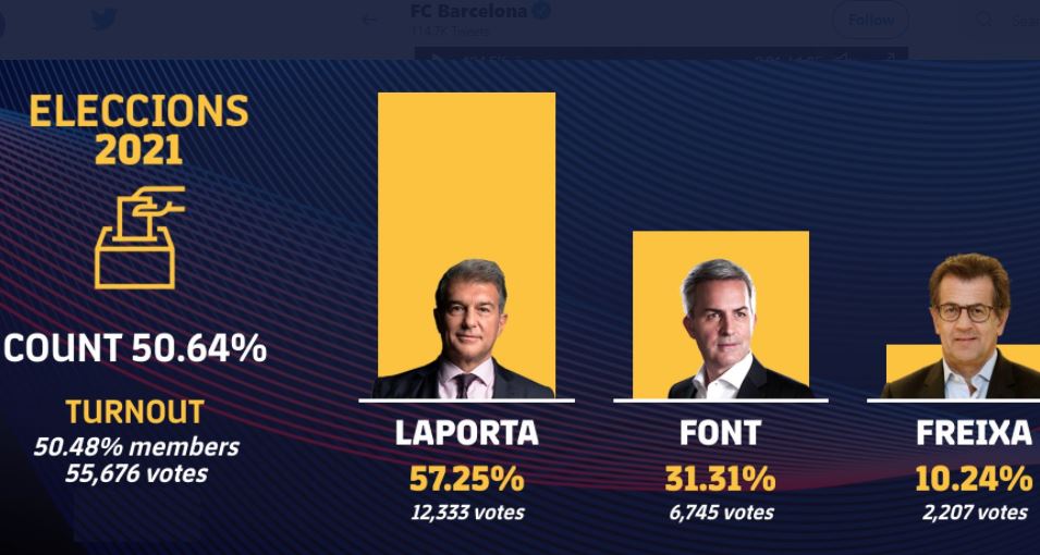 Laporta total meraup 54,28 persen suara. Dia mengungguli Victor Font yang hanya mampu mengumpulkan 29,99 persen suara dan Antoni Freixa (8,58 persen). Hasil ini tidak terlalu mengejutkan mengingat Laporta memang menjadi unggulan untuk mengisi jabatan tersebut.