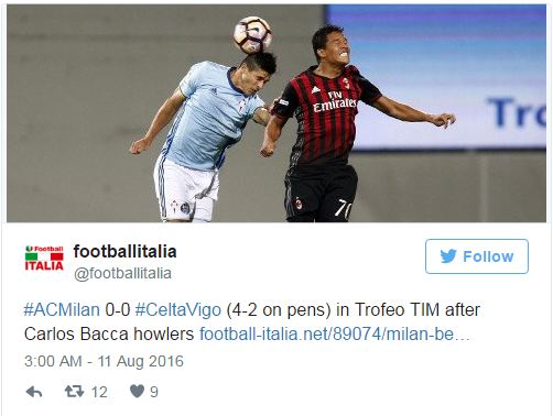 Pada edisi 2016, AC Milan mengawalinya dengan menghadapi klub La Liga, Celta Vigo. Selama 45 menit, duel keduanya hanya berakhir imbang tanpa gol.
