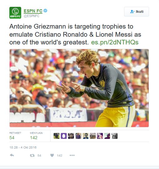 "Saya rasa, saya masih bisa melakukan banyak hal agar bisa berada satu level dengan mereka (Messi dan Ronaldo), hal itu dapat dilakukan dengan memenangi banyak trofi," ucap Griezmann seperti dilansir Goal.