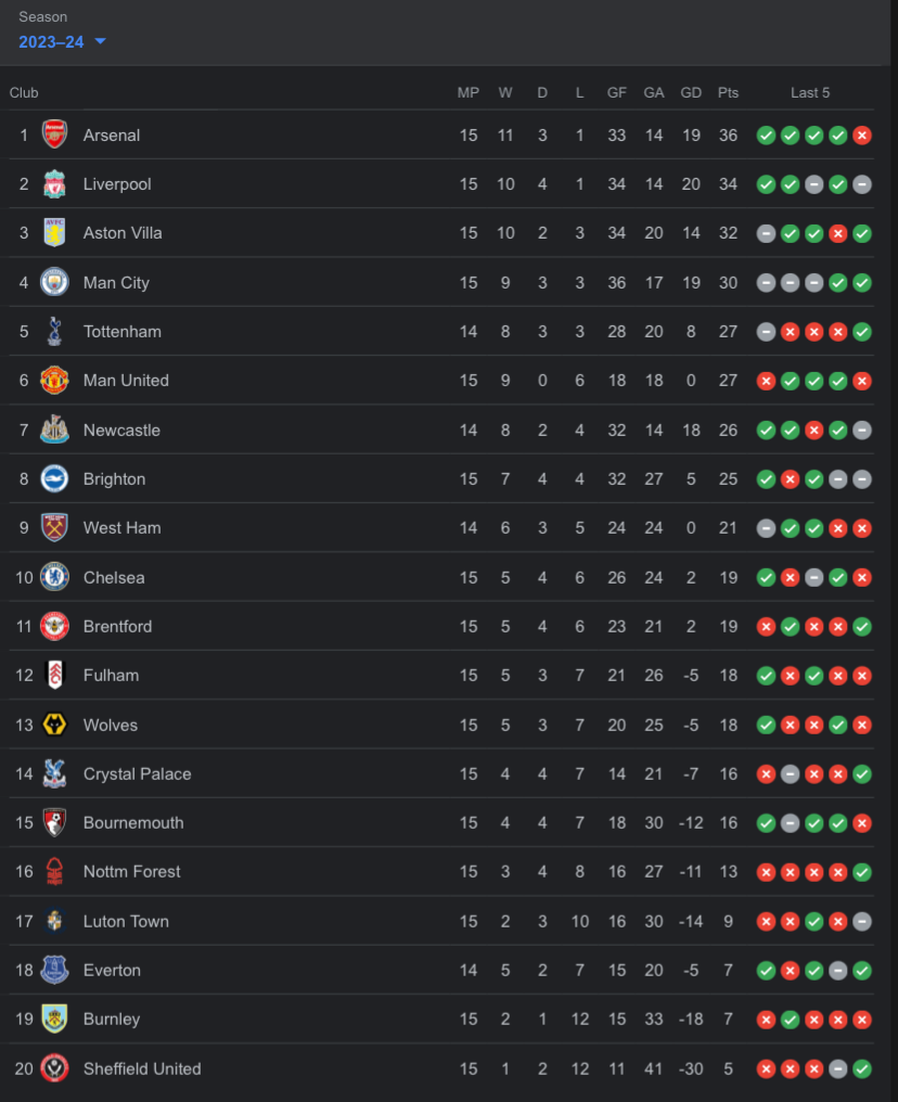 Klasemen Terkini Premier League: Punggung Arsenal Mulai Terlihat, Manchester United dan Liverpool Berdekatan