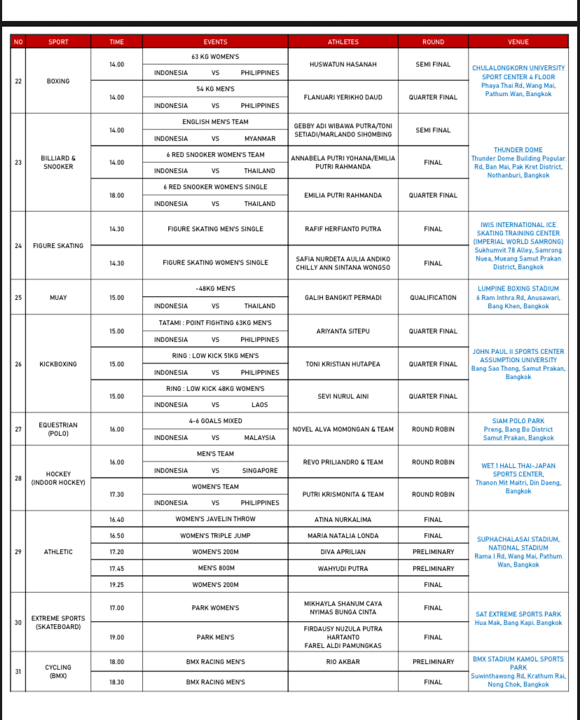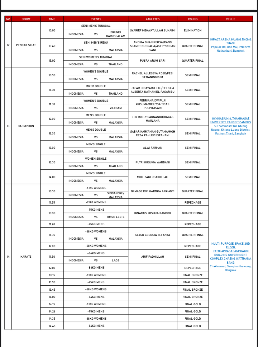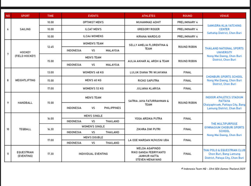 Jadwal Tim Indonesia di SEA Games 2025 Hari Ini, Sabtu (13/12):
