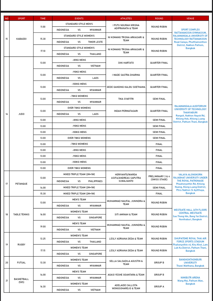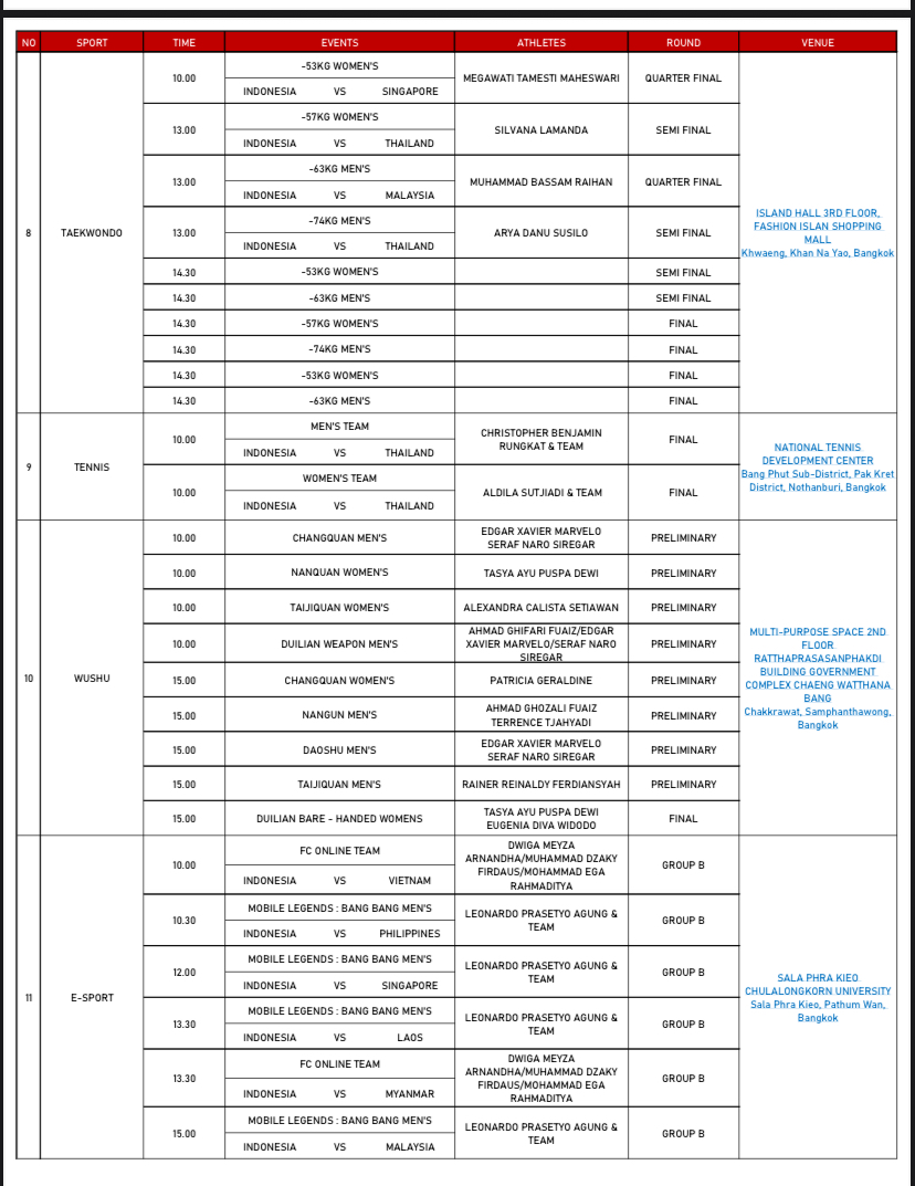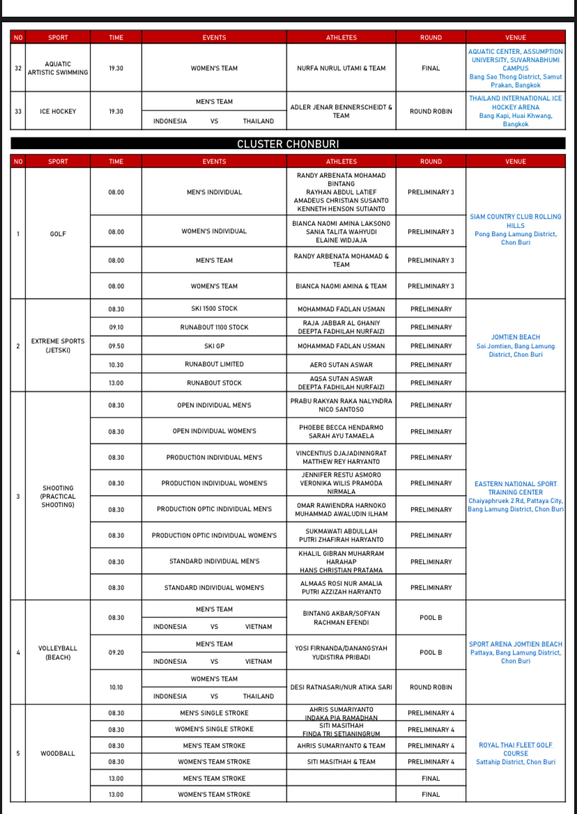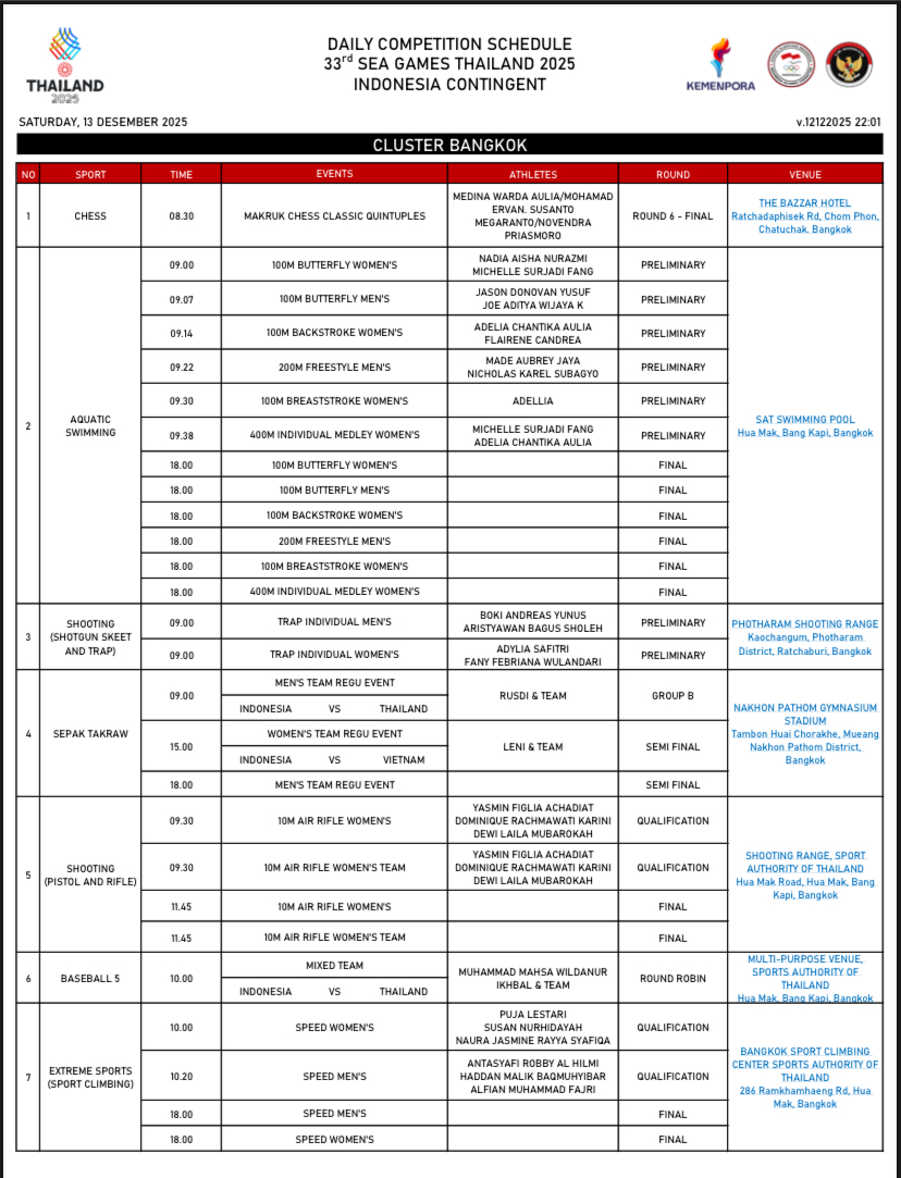 Di hari ke-5 penyelenggaraan SEA Games 2025, Tim Indonesia bertanding di cabang olahraga renang, menembak, sepak takraw, baseball, taekwondo, hingga woodball.