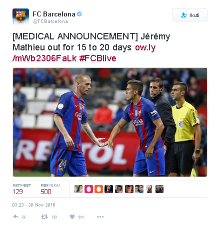 "Dalam tahap akhir pemulihan cederanya, Mathieu mendapat masalah di kaki kanannya. Menurut tim medis klub, ia akan absen dalam 15 hingga 20 hari ke depan. Dan dengan ini dipastikan ia akan absen dalam pertandingan melawan Real Madrid, Borussia Monchengladbach dan Osasuna."