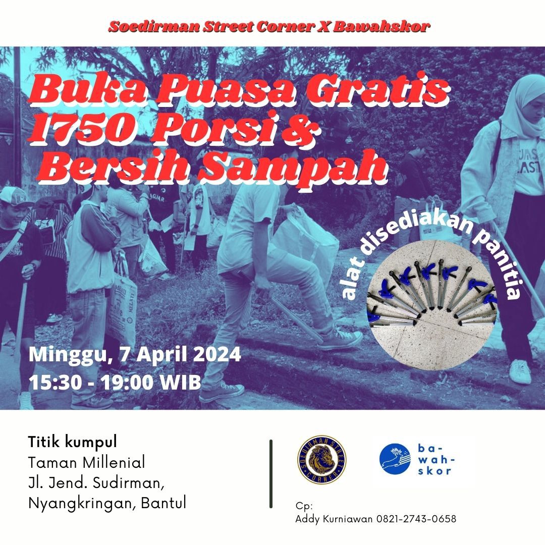 Bawah Skor bersama Soedirman Street Corner menggelar kegiatan buka puasa bersama dengan 1750 porsi, dan membersihkan sampah Lapangan Paseban, Bantul, Yogyakarta, Minggu (7/4) sore WIB.