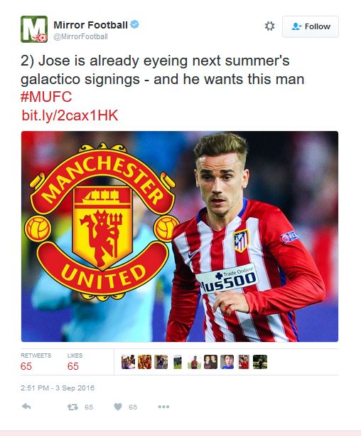 Griezmann kini disebut-sebut sejajar dengan Cristiano Ronaldo, Lionel Messi, dan Luis Suarez. Oleh karena itu, Manchester United mengetahui bahwa mereka kemungkinan harus memecahkan rekor transfer klub senilai 89 juta poundsterling sekitar ( 1,3 Triliun) yang mereka bayarkan untuk mendatangkan Paul Pogba.
