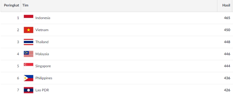Nilai yang diperoleh lebih besar dari tim beregu Vietnam. Vu Tien Dung, Nguyen Xuan Thanh, dan Luu Van Nam mendapat nilai 450.