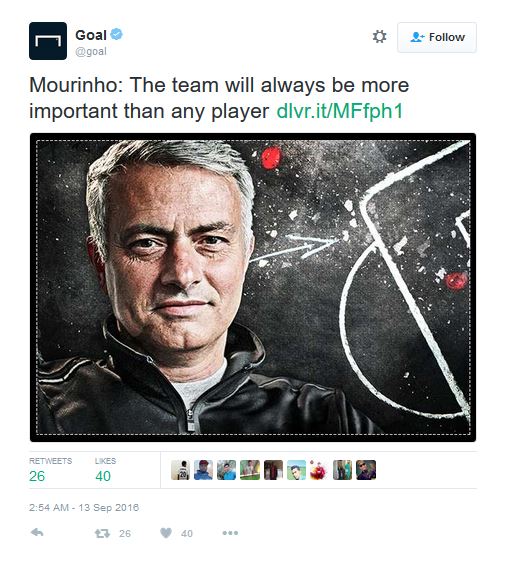 "Bagi saya tim akan selalu jadi lebih penting ketimbang pemain manapun. Ada individu di dalamnya, seperti saya, untuk melayani tim, memberikan yang terbaik untuk tim. Kecuali ada situasi khusus yang menuntut satu lawan saya, saya melatih tim, saya tidak melatih individu dan lebih suka berbicara kepada semuanya," ucap Mourinho kepada Goal, Selasa (13/09/16).