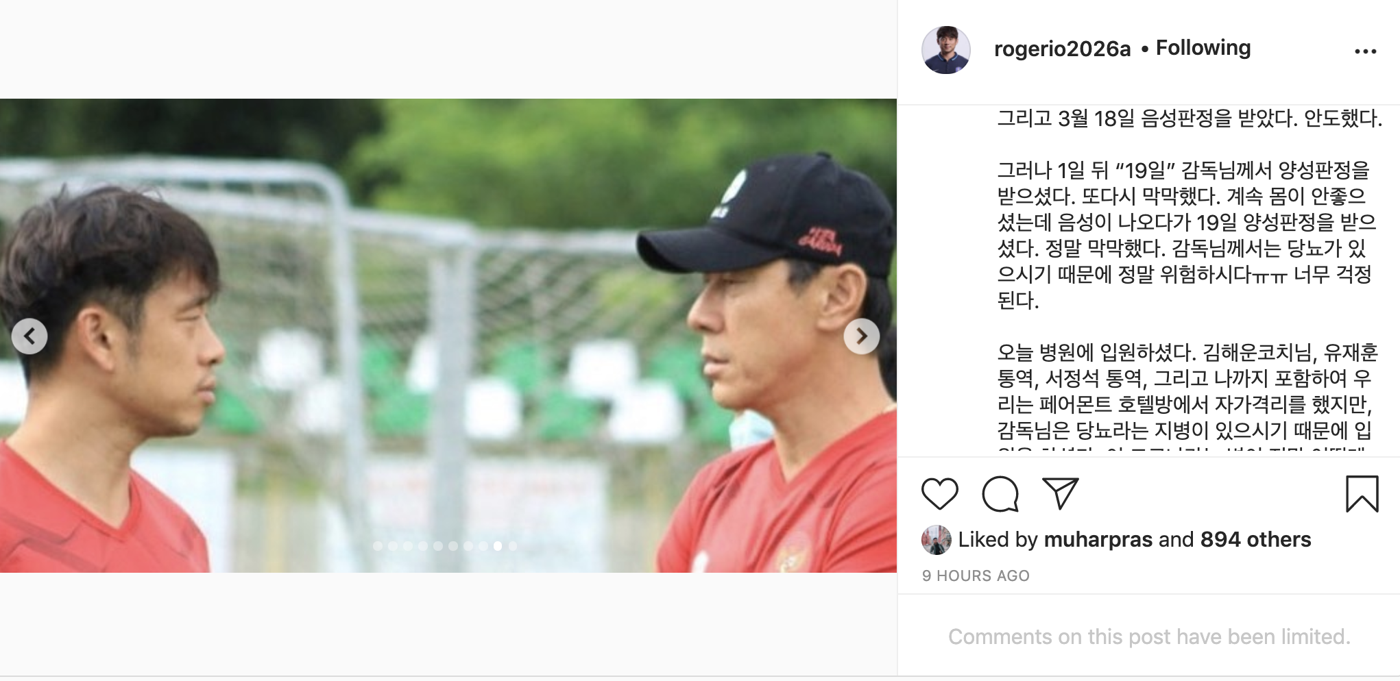 "Saya merasa tidak enak badan sejak awal Maret. Sementara itu, pada hari ketiga penerjemah Yoo Jae-hoon dinilai positif dan hari keenam pelatih Kim Hae-woon dinilai positif. Namun setelah pertandingan melawan Bali United pada tanggal 7, saya merasa sangat buruk. Dan pada tanggal 8 saya dikonfirmasi," tulisnya di akun Instagram.