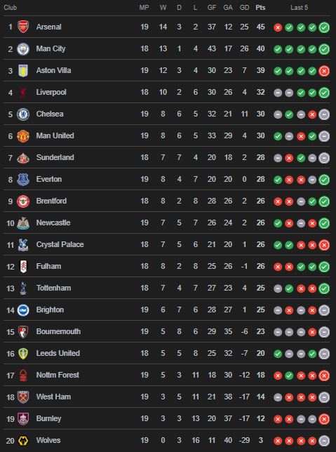 Chelsea dan Man United kini sama-sama meraih 30 poin, lalu di bawah keduanya sampai urutan 10 adalah Sunderland (28 poin), Everton (28 poin), Brentford (26 poin), dan Newcastle United (26 poin).