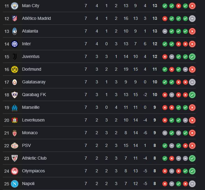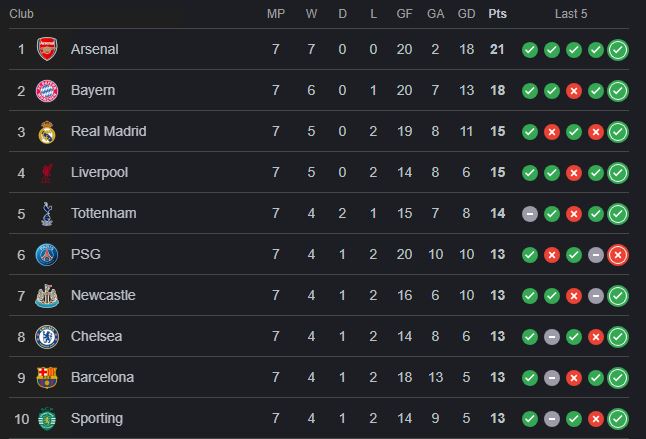 Saat ini dari urutan tiga hingga delapan klasemen ditempati Real Madrid (15 poin), Liverpool (15 poin), Tottenham Hotspur (14 poin), Paris Saint-Germain (PSG) (13 poin), Newcastle United (13 poin), dan Chelsea (13 poin).