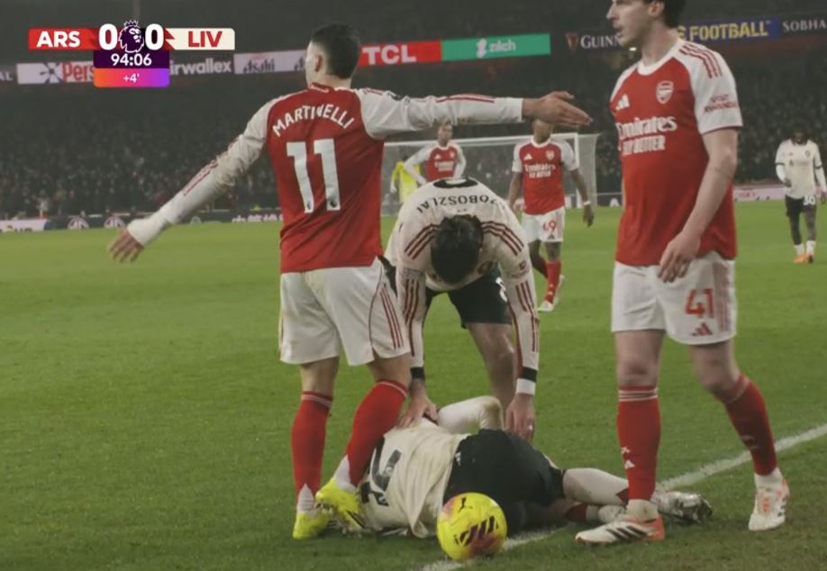 Panasnya laga tersebut berlanjut saat Conor Bradley jatuh dan cedera, namun saat ia mengerang kesakitan, Gabriel Martinelli melemparnya dengan bola dan bahkan mendorongnya agar keluar lapangan pertandingan.