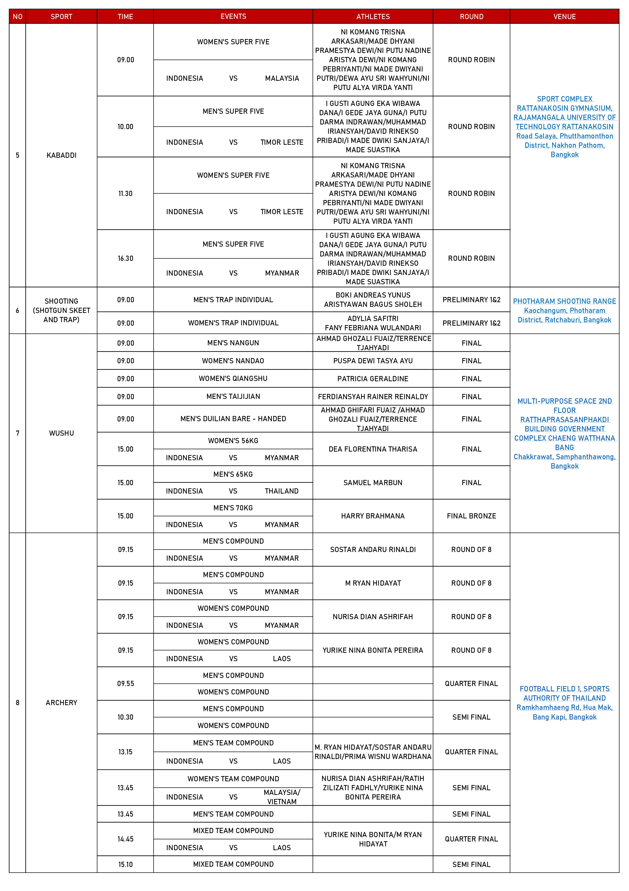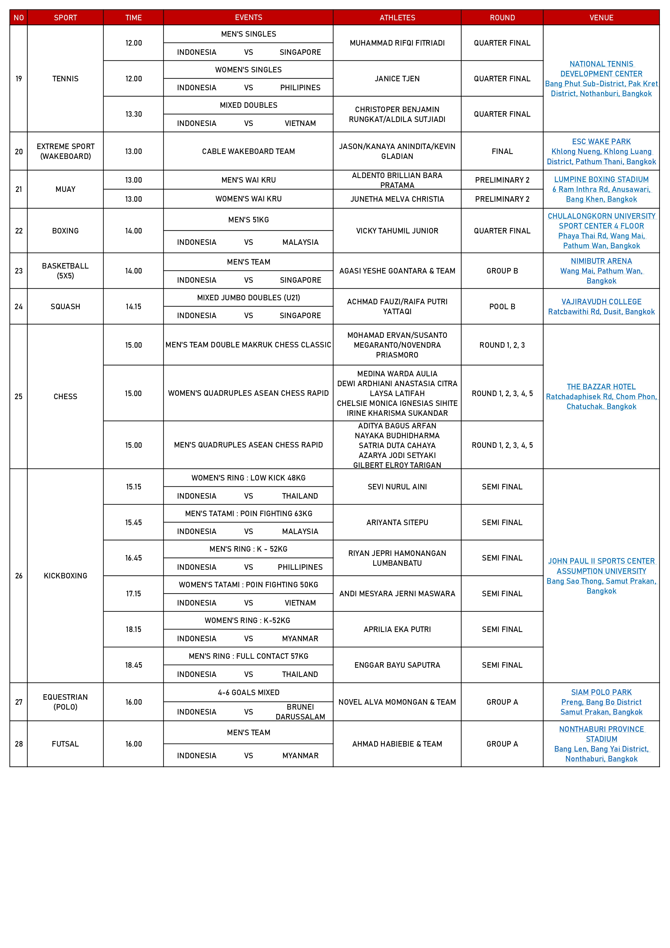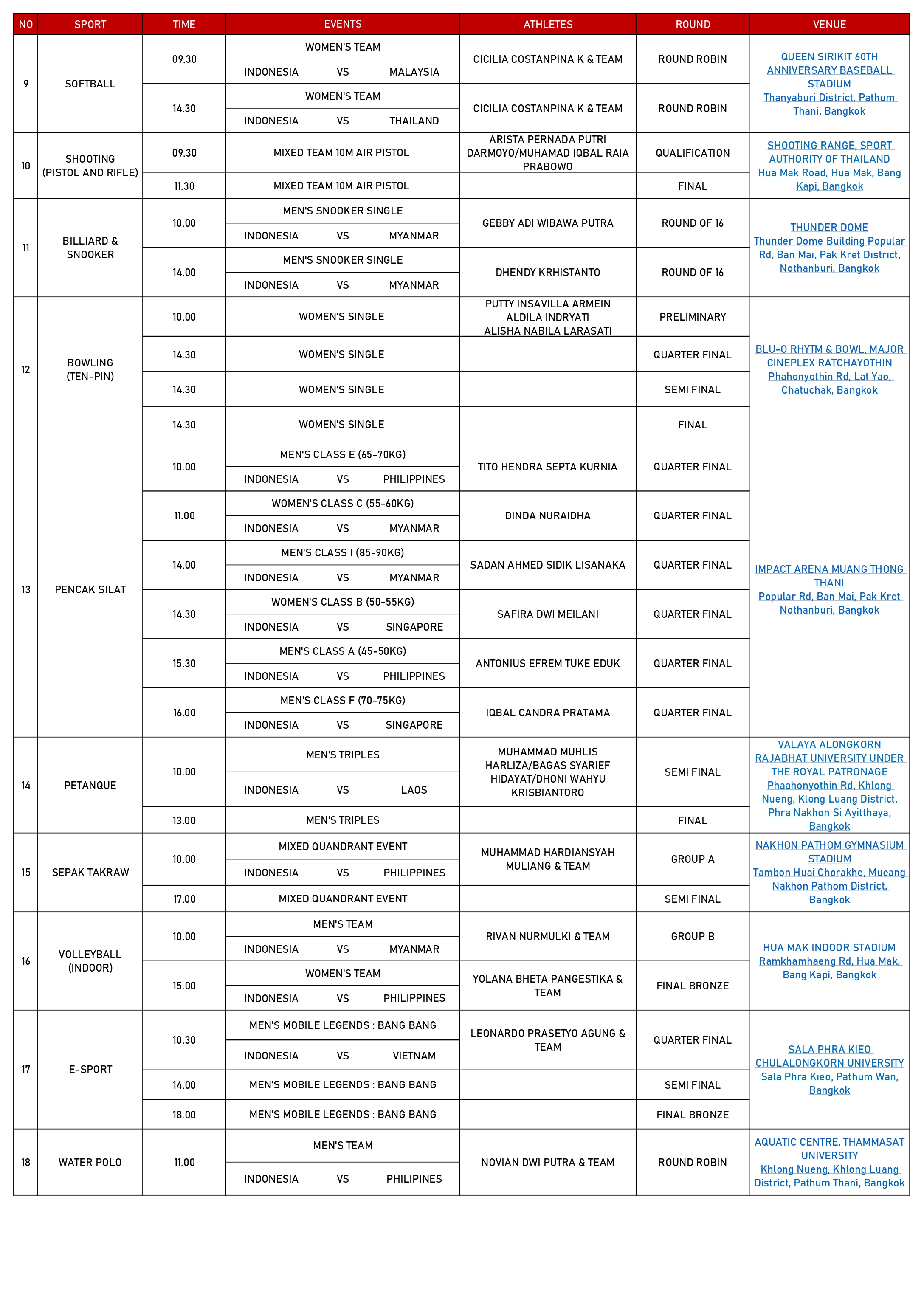 Lalu untuk cabor lain, hari ini akan ada pertandingan renang yang memperebutkan delapan medali emas bertempat di Kolam Renang Sports Authority of Thailand, Bangkok.