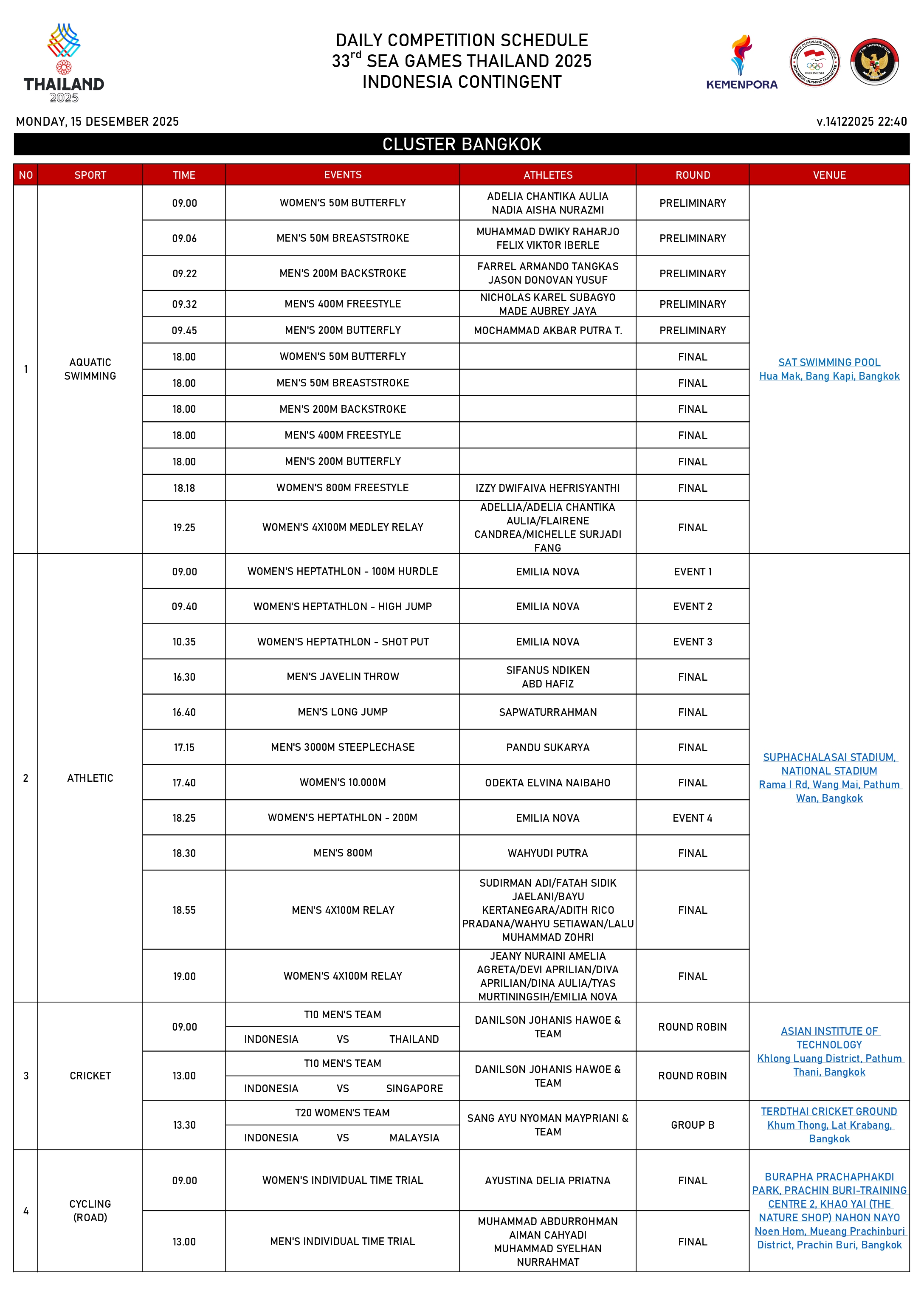 Berikut jadwal SEA Games 2025 Tim Indonesia pada Senin (15/12):